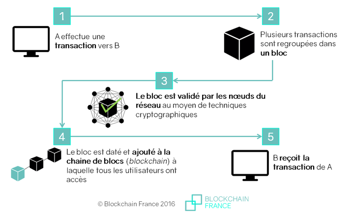 La blockchain est une technologie de stockage et de transmission d’informations, transparente, sécurisée, et fonctionnant sans organe central de contrôle (définition de Blockchain France). Par extension, une blockchain constitue une base de données qui contient l’historique de tous les échanges effectués entre ses utilisateurs depuis sa création. Cette base de données est sécurisée et distribuée : elle est partagée par ses différents utilisateurs, sans intermédiaire, ce qui permet à chacun de vérifier la validité de la chaîne.-Situer la blockchain